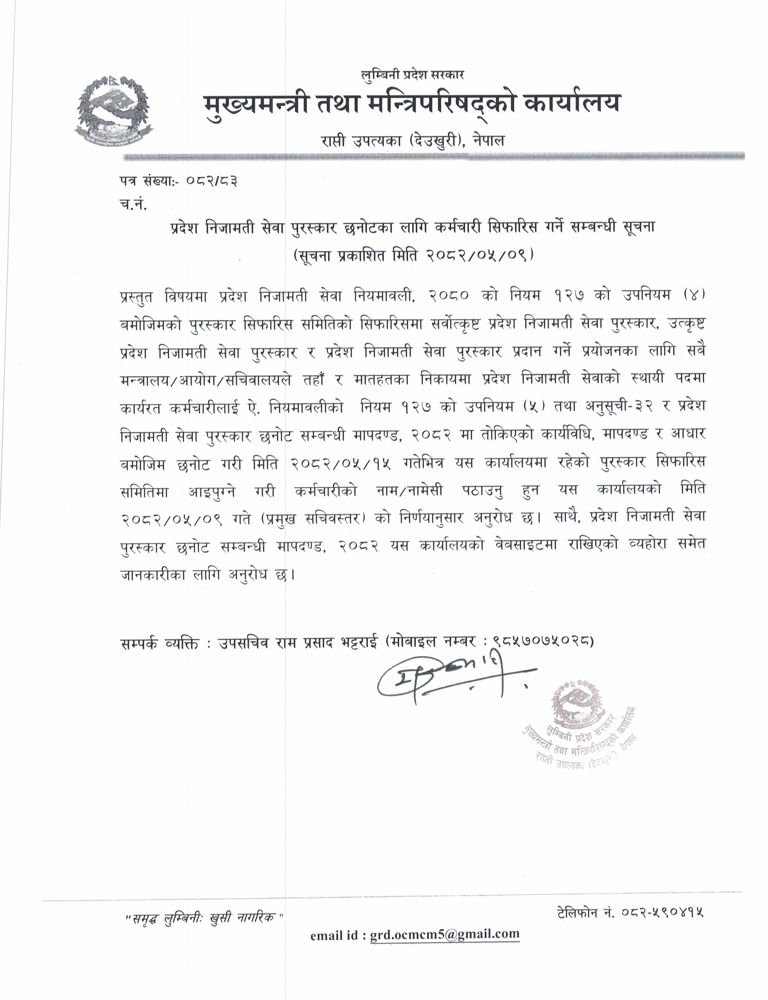 प्रदेश निजामती सेवा पुरस्कार छनोटका लागि कर्मचारी सिफारिस गर्ने सम्बन्धी सूचना